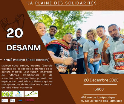 Comme chaque année, le 20 décembre est célébré à la Plaine des Solidarités avec divers intervenants qui viennent présenter leurs prestations lors de cette journée emblématique. Cette journée, centrée sur l'histoire des marrons de notre île, est aussi une célébration de la liberté de nos ancêtres. Elle revêt une grande importance pour notre association, et nous souhaitons partager ces moments avec le public.