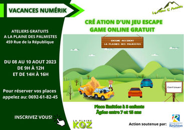 Premier projet porté par notre association. C'est la génèse de nos travaux sur le numérique, l'aller vers, et la création de l'espace numérique. Ce projet nous a permis d'approfondir notre compréhension des besoins des habitants de Palmiplainois en matière de numérique et de tisser des liens avec eux. Lors du déploiement du dispositif, nous avons organisé des sorties pédagogiques axées sur le numérique, afin de faire découvrir aux enfants de la Plaine des Palmistes les différents métiers du secteur.